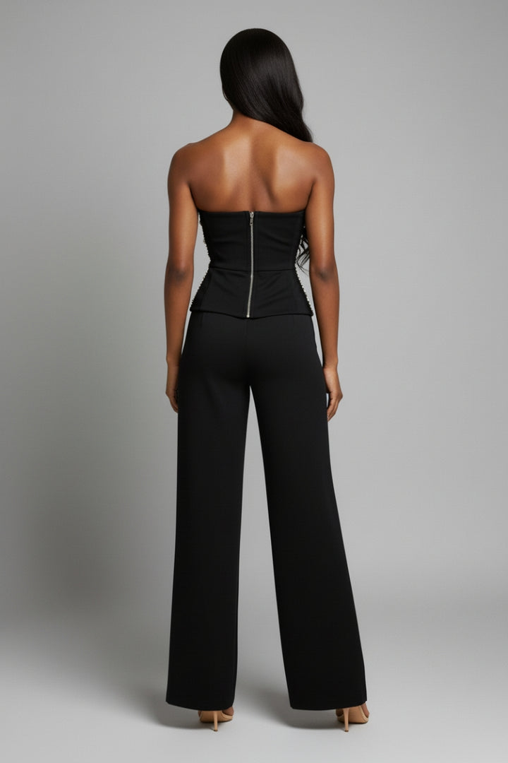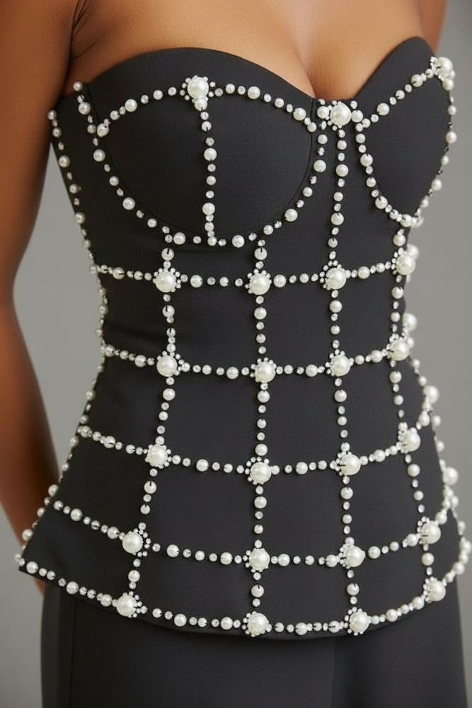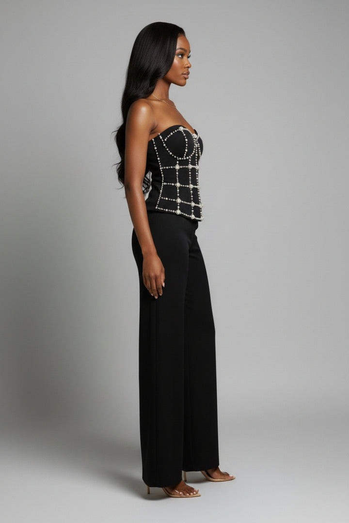 Elevate your evening wardrobe with the Arielle Luxe Pant Set, a sophisticated two-piece ensemble designed for refined elegance. The strapless top features a delicate grid pattern adorned with rhinestones and pearl embellishments. Structured with built-in underwire cups and a subtle peplum silhouette, it offers both support and flattering dimension. The coordinating mid-rise straight-leg pants provide a polished foundation.