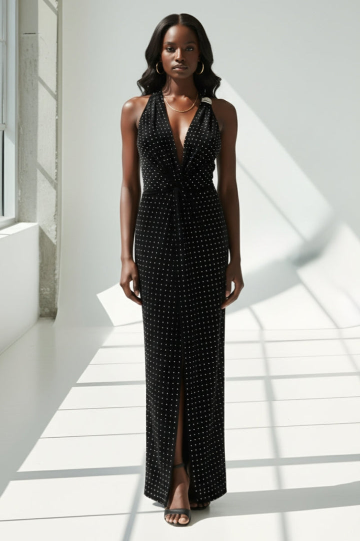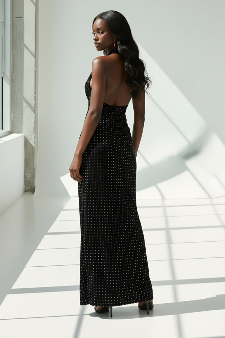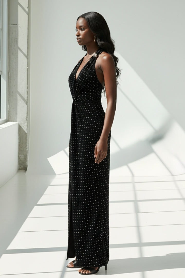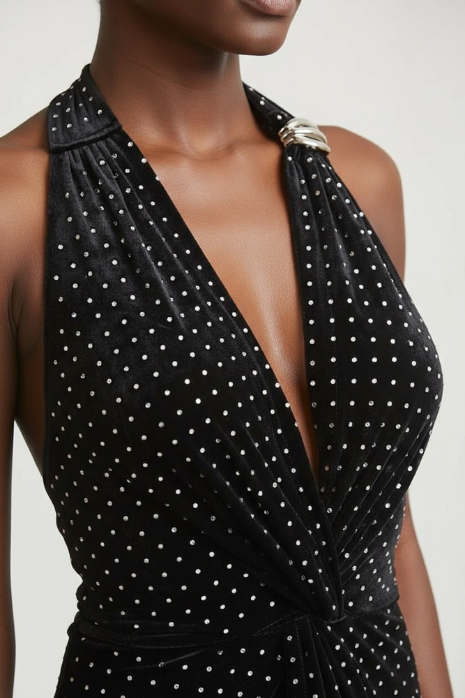 Elevate your evening look with this luxurious halter neck piece, crafted from sumptuous soft velvet that drapes beautifully against the skin. Intricate hotstone detailing sparkles throughout, creating an eye-catching shimmer that commands attention. The halter neckline is finished with a striking silver metal accent, adding a refined touch of glamour. Perfect for special occasions when you want to make a sophisticated statement.