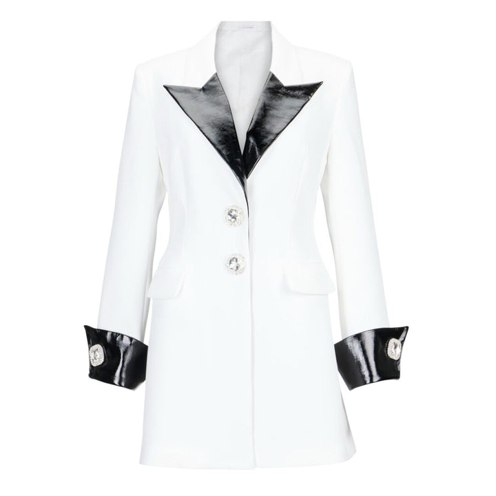 Indulge in refined fashion with our Ola Blazer. Its tuxedo style exudes sophistication, while the cinched waist flatters your figure. The faux leather lapel and cuff add a touch of luxury, completed with rhinestone button details. Elevate your style with this exclusive piece.