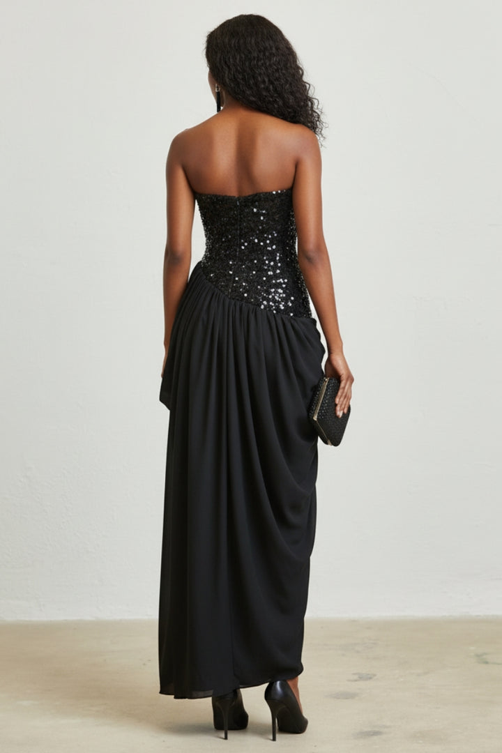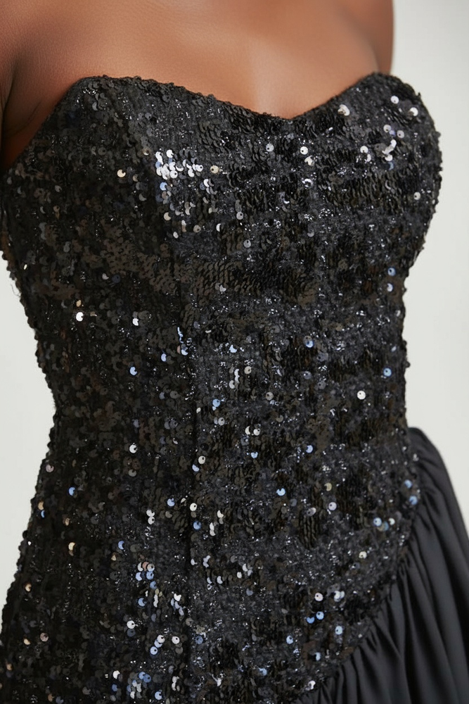 Elevate your evening wardrobe with this striking cocktail dress that seamlessly blends structured elegance with fluid movement. The soft tweed bodice features intricate sequin detailing that catches the light beautifully, while the pointed bustline and integrated bra cups provide flattering support. Corset boning creates a sculpted silhouette, complemented by an artfully unbalanced waistline that adds contemporary edge. The chiffon maxi skirt flows gracefully with high-low hemming and dramatic pleats, delivering both sophistication and dynamic style for any formal occasion.